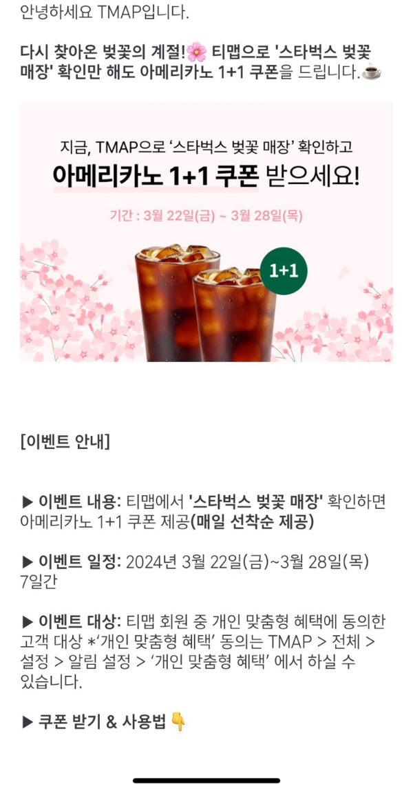 3월 22일부터 28일까지 일주일간 티맵에 나와있는 '티맵 테마코스' 벚꽃 매장 소개 하단에 '아메리카노 1+1'쿠폰' 증정을 하고,