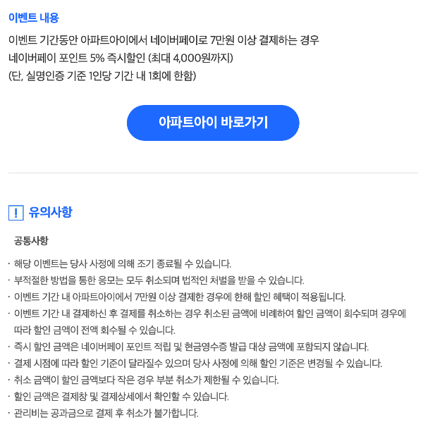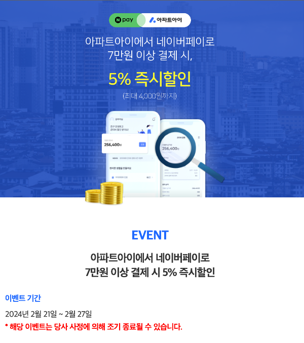 2) 2024년 2월 아파트아이에서 네이버페이로 7만원 이상 결제시, 최대 4천원까지 5% 즉시할인 받을 수 있어요.