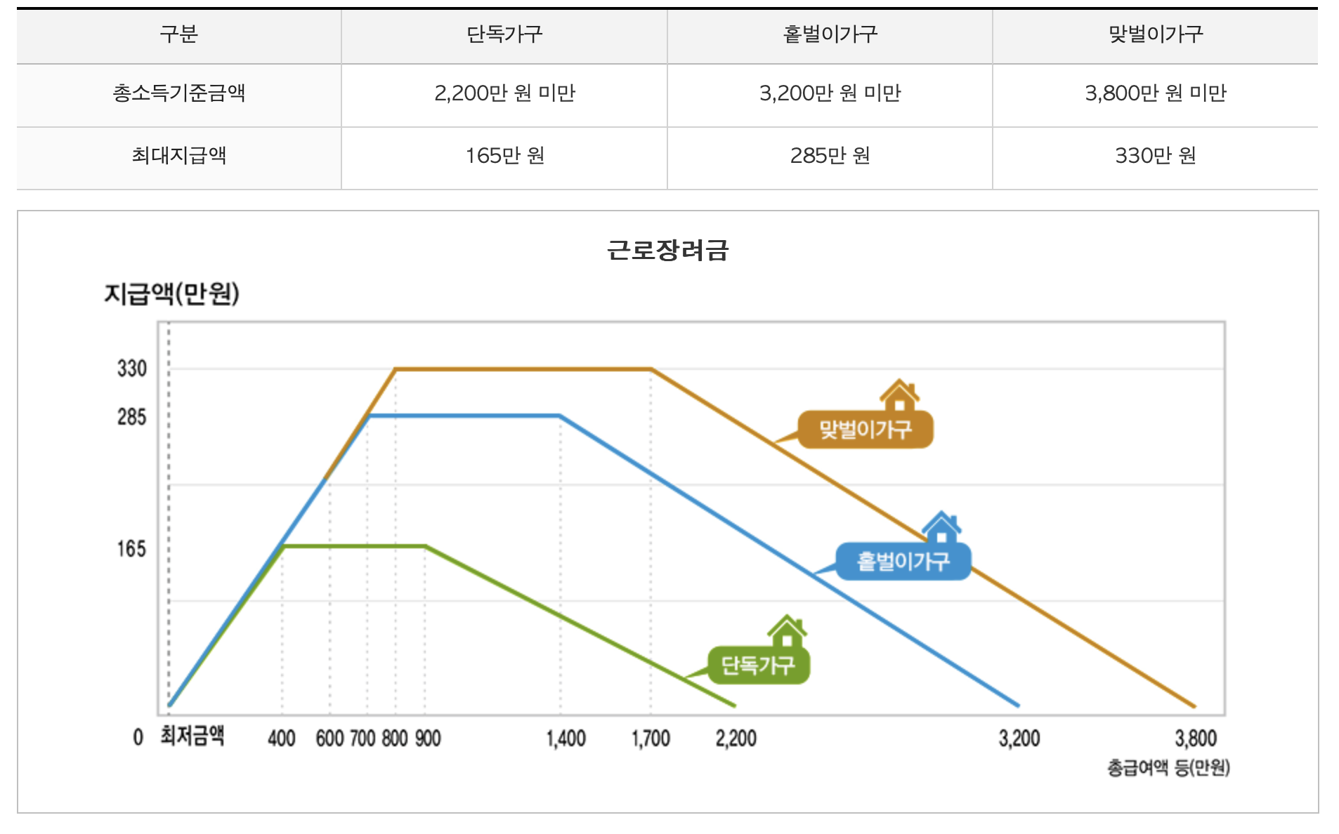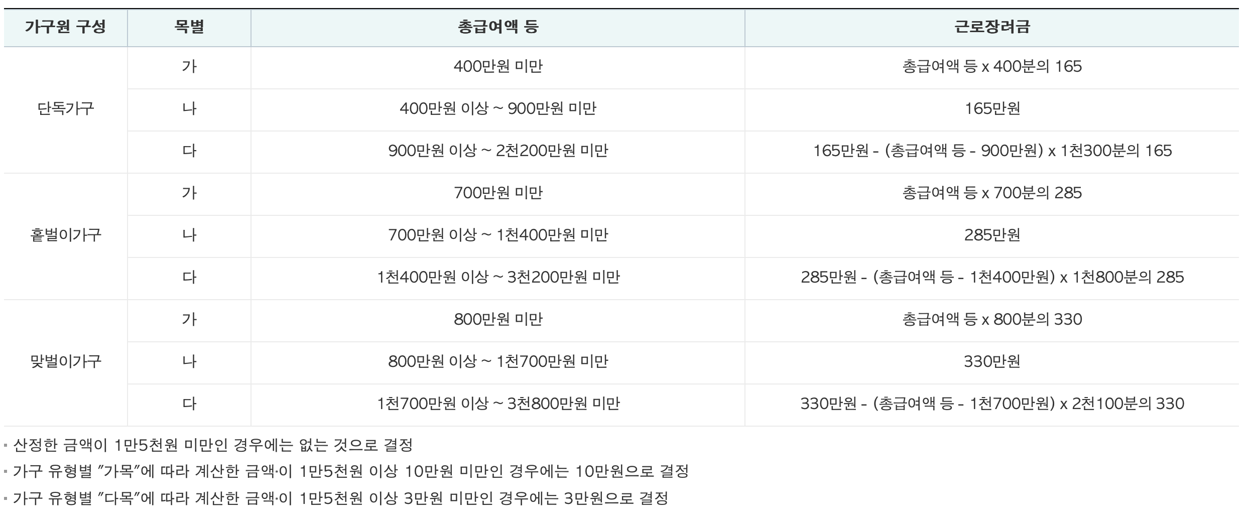 ✅ 가구유형에 따른 근로장려금 지급가능액