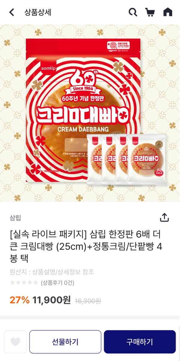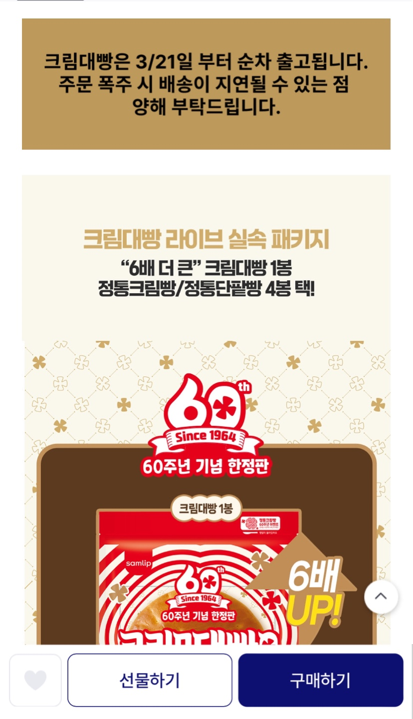 [실속 라이브 패키지] 삼립 한정판 6배 더 큰 크림대빵 (25cm)+정통크림/단팥빵 4봉 택